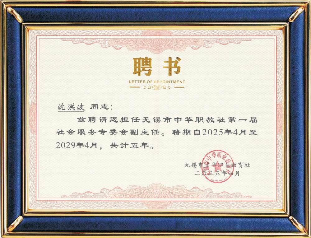 中華職教社社會(huì)服務(wù)專委會(huì)副主任 聘書