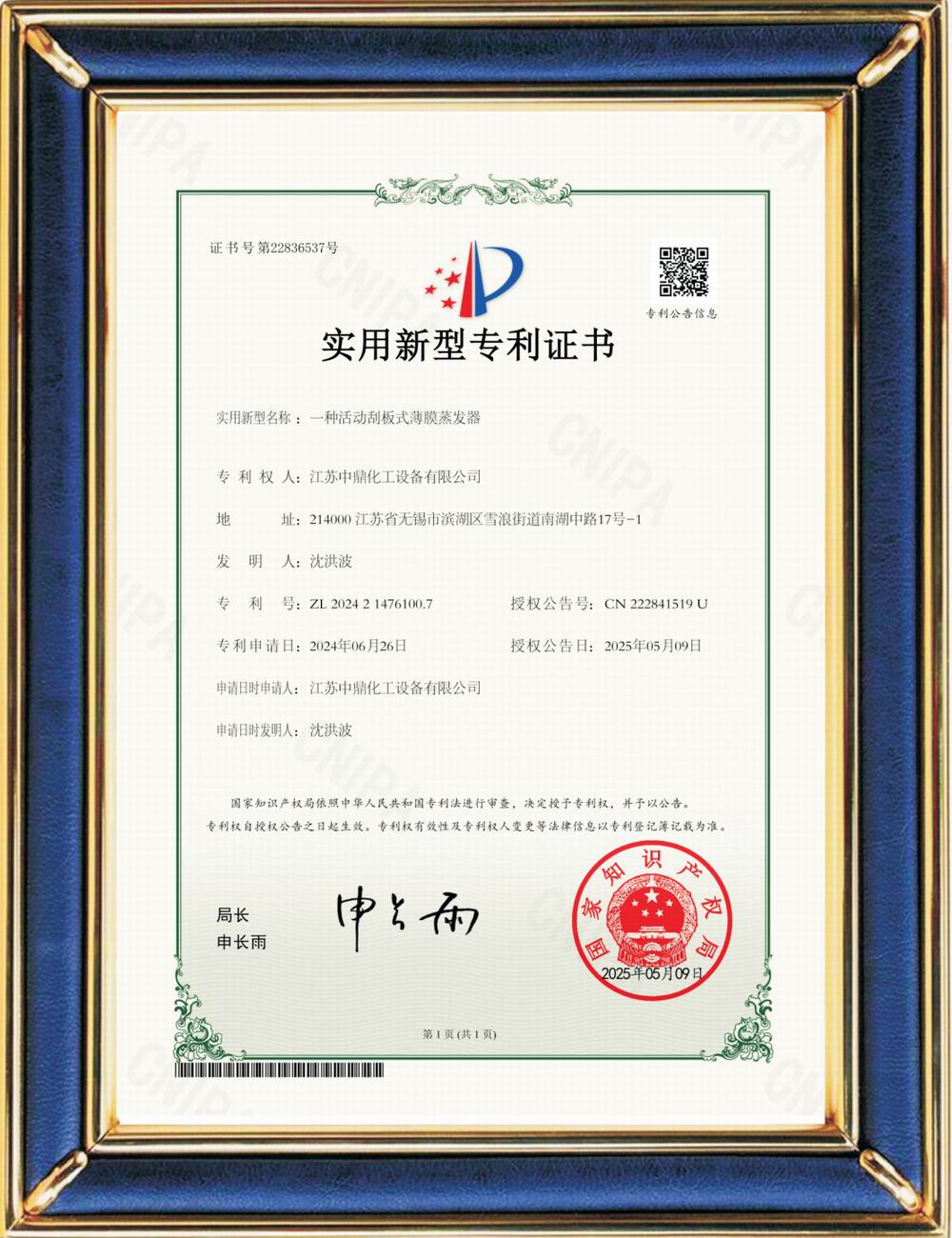 鉸鏈刮板式薄膜蒸發(fā)器(專利證書)