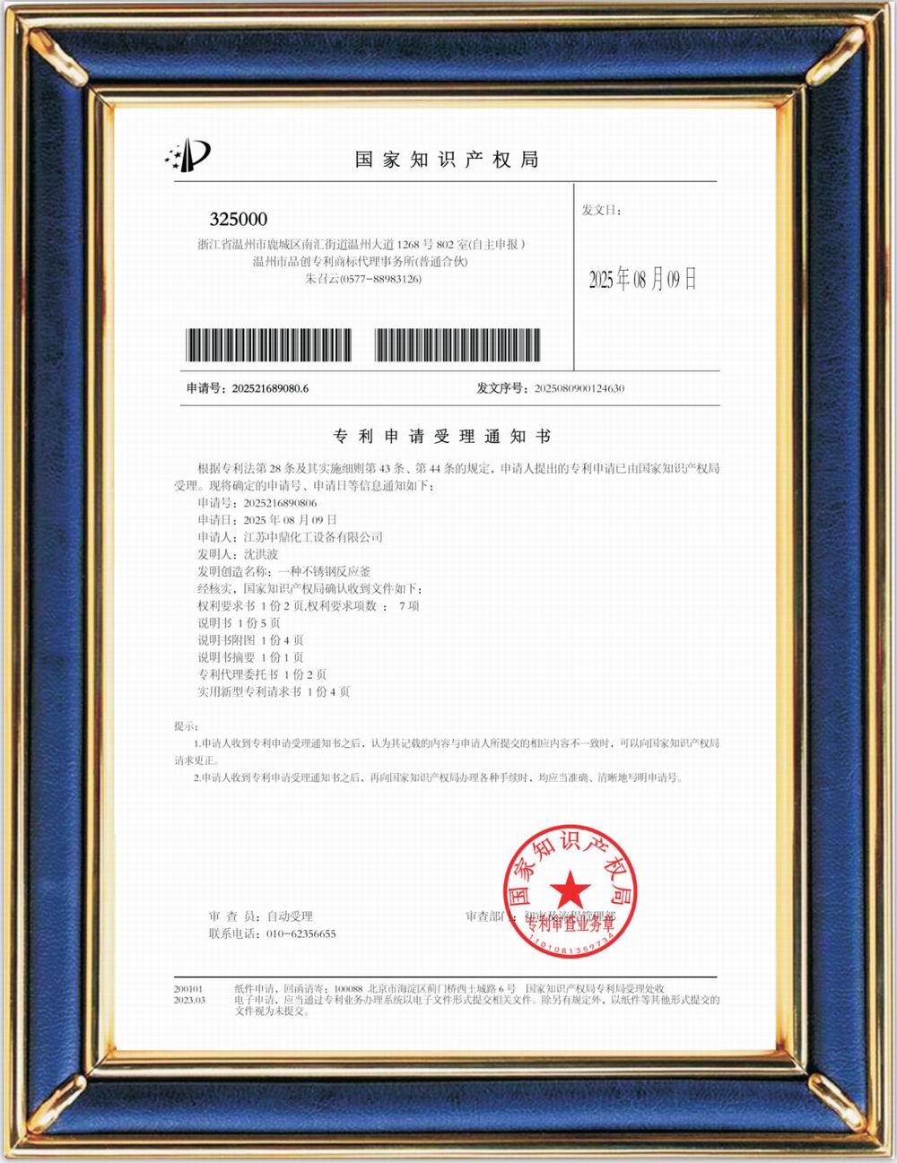 受理中實(shí)用專利通知書:一種不銹鋼反應(yīng)釜