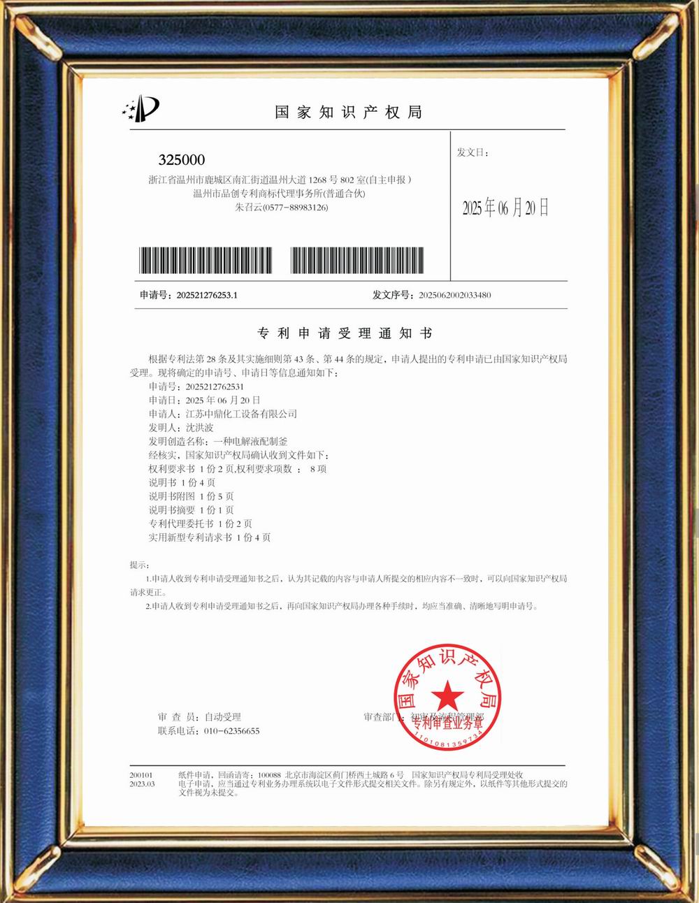 受理中實(shí)用專利通知書:電解液配制釜