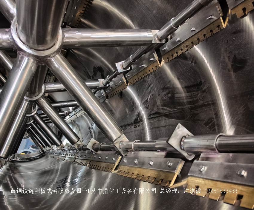 固定刮板:用金屬材料剛性連接在轉(zhuǎn)子上,長度與蒸發(fā)筒身相同,間隙1 - 2mm,加工安裝精度高,適用于特高粘度及易起泡沫物料。