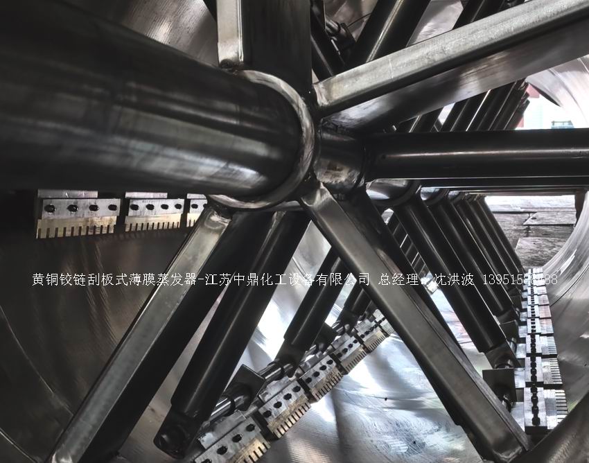 如果是蒸汽溫度一般在180°以下,導(dǎo)熱油溫度一般在280°以下,熔鹽溫度一般在380°以下。刮板也稱刮刀(刮板分為:玻纖四氟刮板、碳纖維四氟刮板、石墨四氟刮板、黃銅刮板、合金鋼等)和傳動裝置:電機(jī)(普通變頻電機(jī)、防爆變頻電機(jī)、高速變頻電機(jī)),減速機(jī)(擺線針輪減速機(jī)、齒輪減速機(jī)),機(jī)架,軸封系統(tǒng)(單端面機(jī)械密封、雙端面機(jī)械密封、磁力密封等,如果抽真空必須選用雙端面機(jī)械密封或者磁力密封),轉(zhuǎn)動軸、汽液分離裝置、液體分布器、蒸發(fā)器轉(zhuǎn)子支架、軌道刮板槽、底部軸套等部件組成。